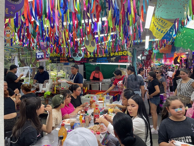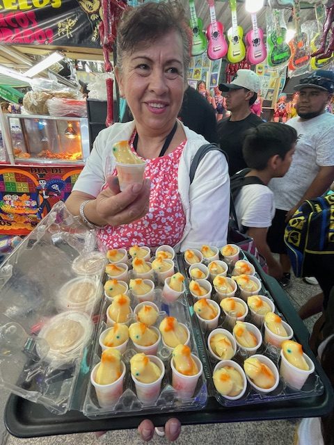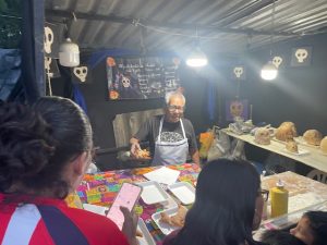 Terminamos el recorrido en el puesto de Don Goyo, un simpático y bonachón churrero que adereza sus preparaciones con una sabrosa conversación. Tiene clientes de años que se arremolinan a su alrededor para platicar con él y ver cómo prepara con una sencilla masa y artística habilidad los churros con forma de calaveras, muertos, sirenas, alacranes, chupacabras y muchas otras figuras que cubre con azúcar (Aquí puedes ver los muertitos de Don Goyo).