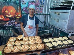 La variedad de pan, invitado central de la feria, es enorme. Ahí mismo se preparan y se hornean. Muchos de los panaderos vienen de Tlaxcala. Uno de estos puestos precisa su origen: San Juan Huactzinco. El pan de muerto es de diversos tamaños. Además, hay trenzados, rellenos de ates o cubierto de ajonjolí. Con nuez, naranja, mantequilla, nata. Conchas y picones. Si se prefiere lo salado, en esos mismos hornos salen enormes porciones de pizzas tradicionales o rellenas.