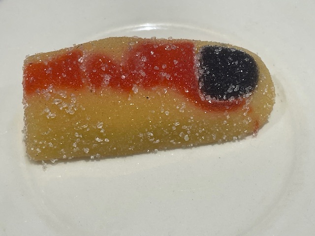 Los visitantes de gusto macabro disfrutan una gomita con forma de dedo ensangrentado tamaño natural, que vende la jovencita que atiende otro puesto.